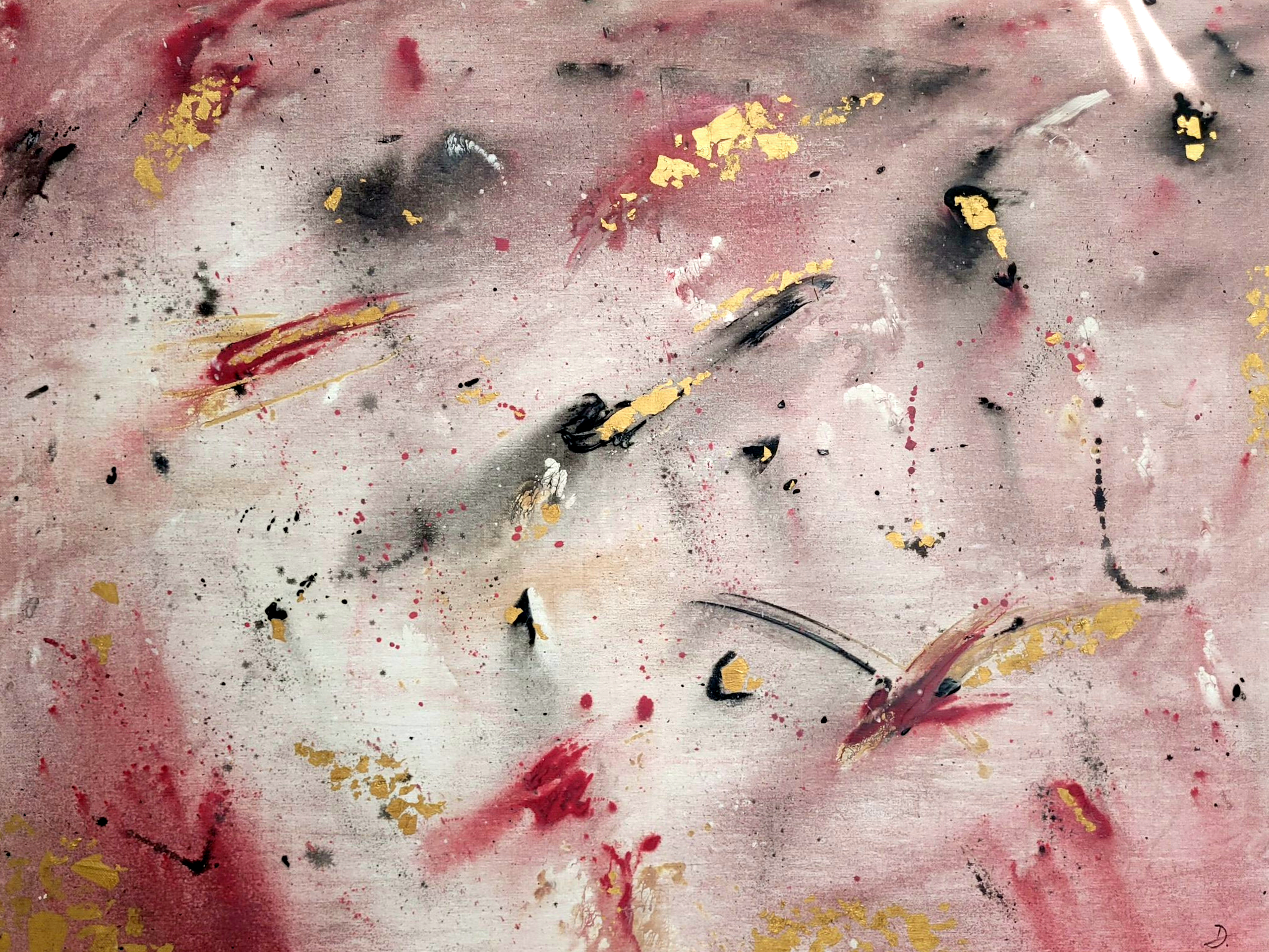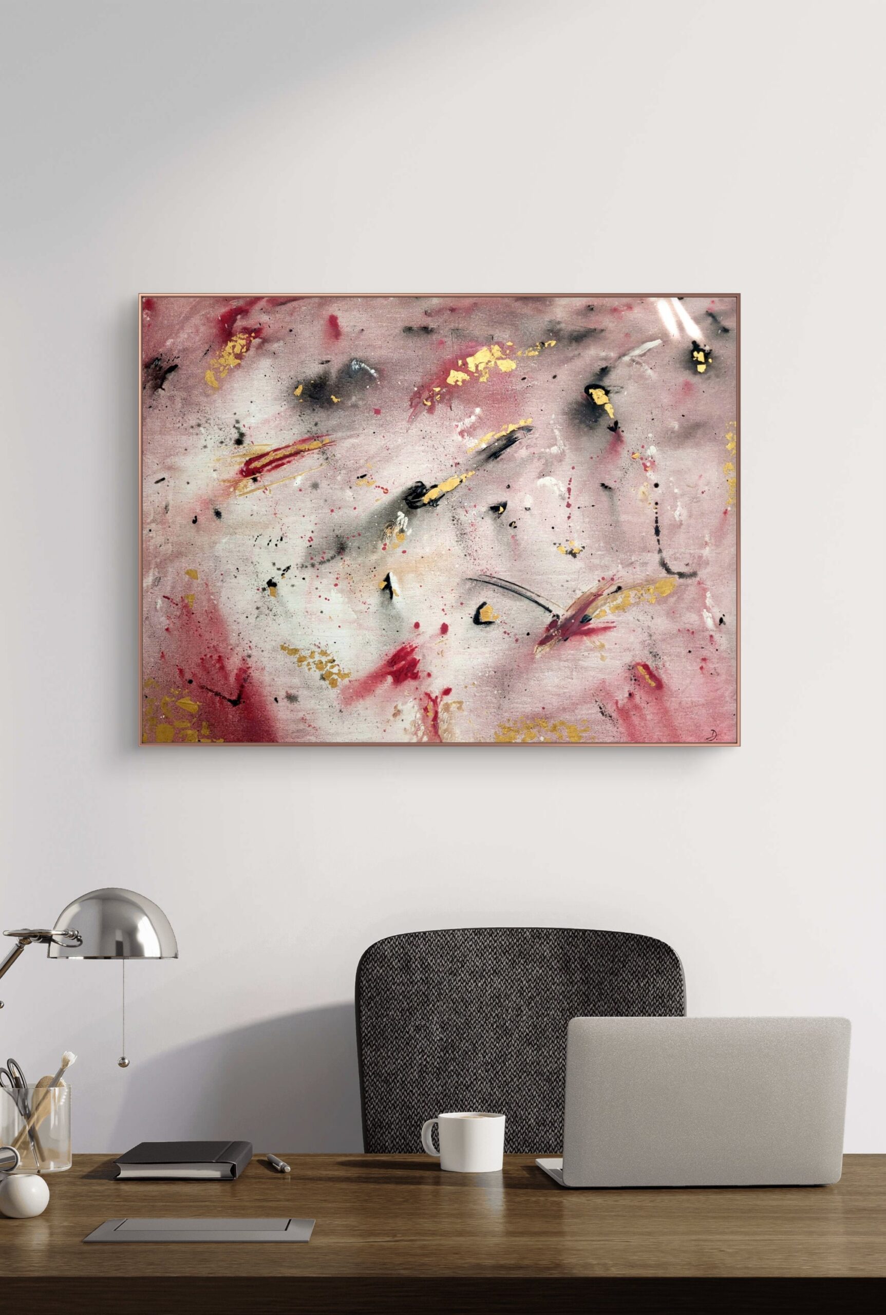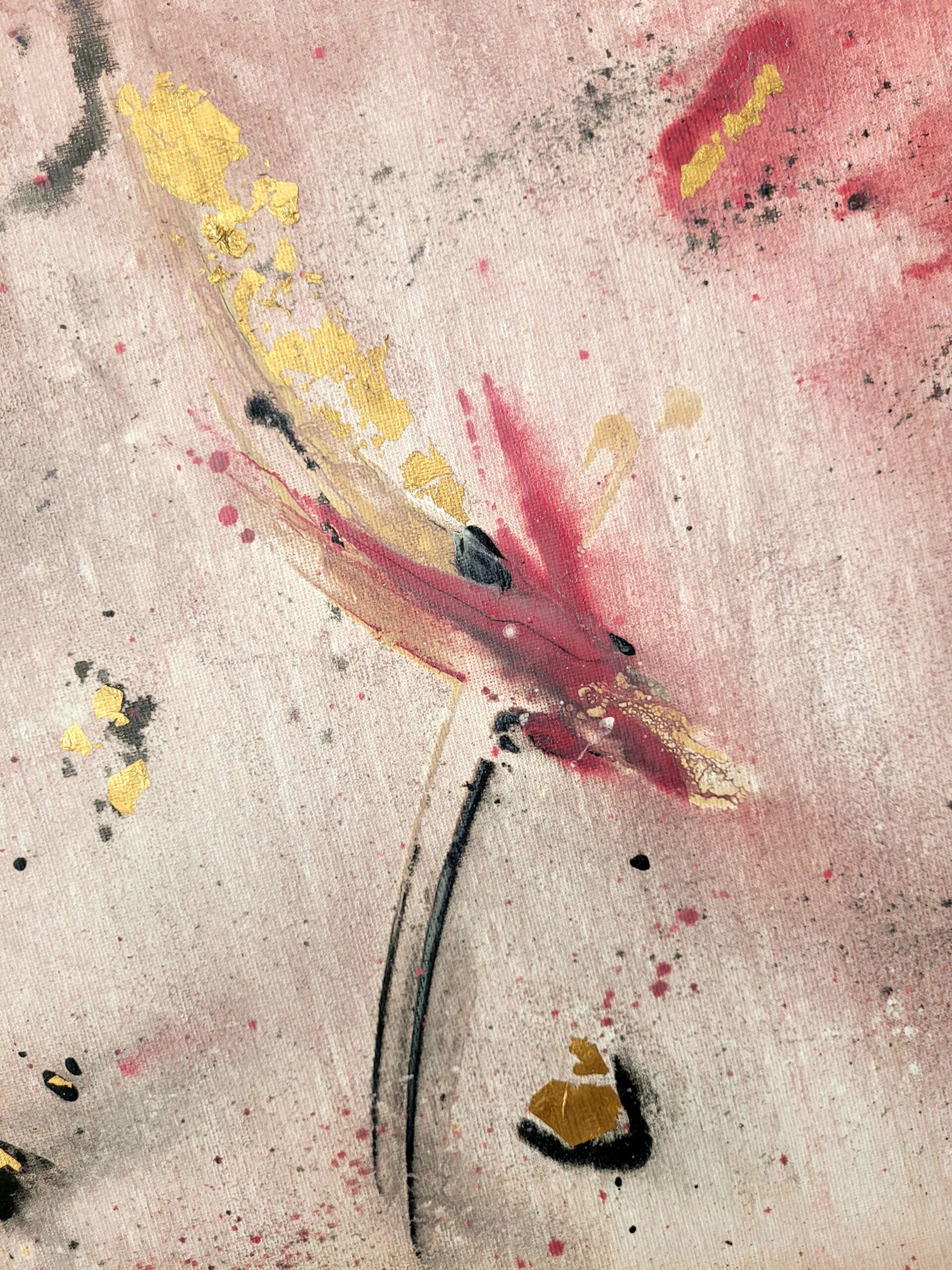 Abstrakcyjny obraz „Roziskrzony Szept” z płatkami złota. Połączenie różu, czerwieni, czerni i złota tworzy dynamiczną, a zarazem subtelną kompozycję, idealną do nowoczesnych wnętrz.