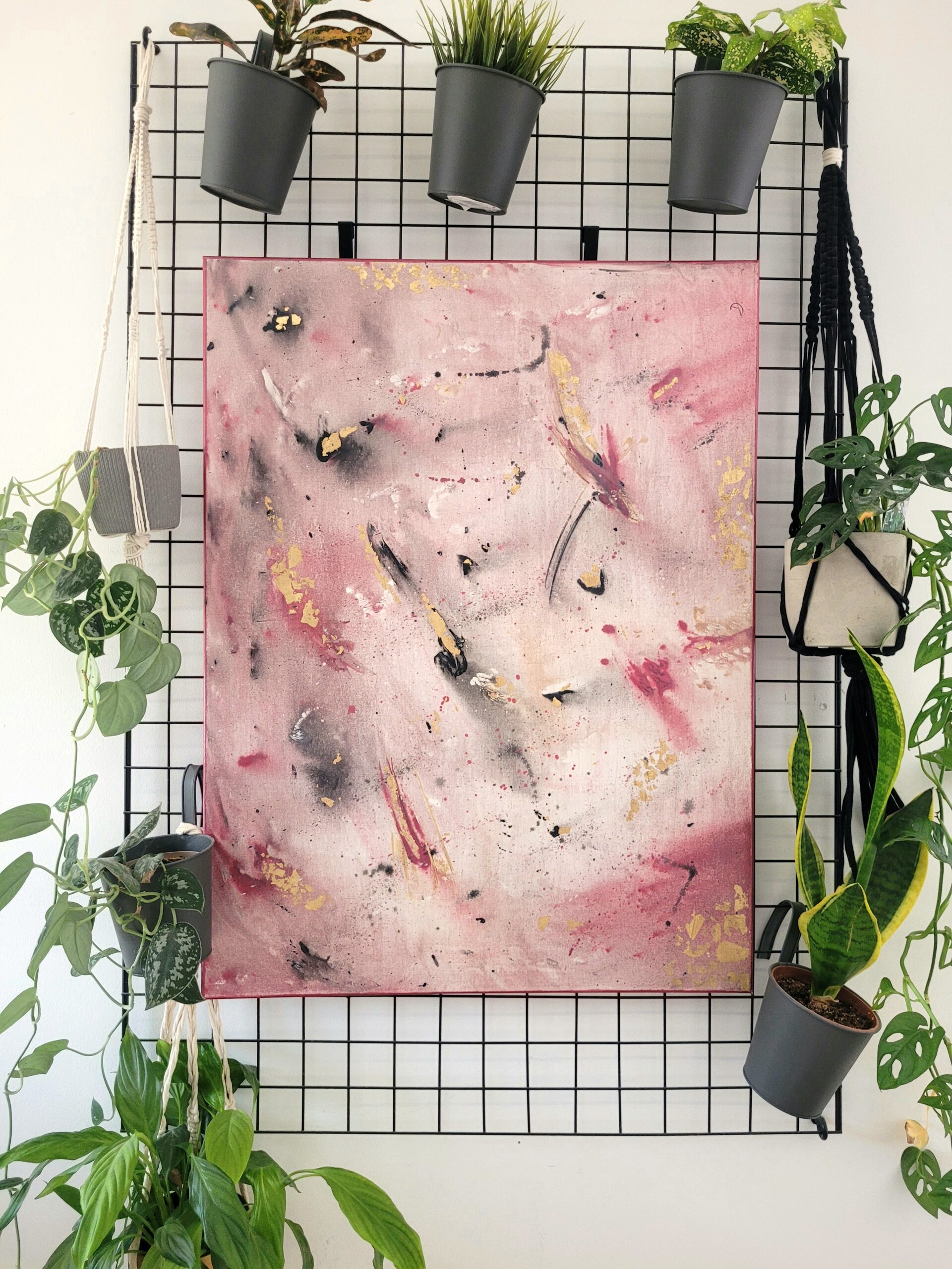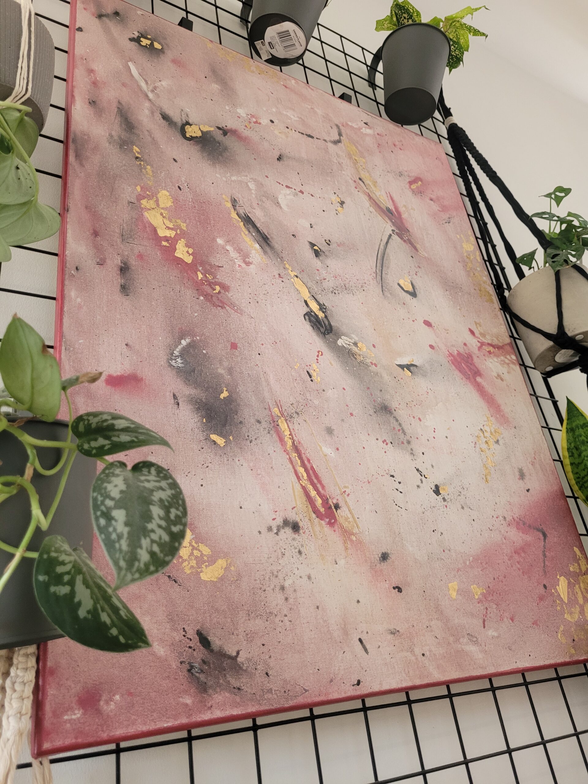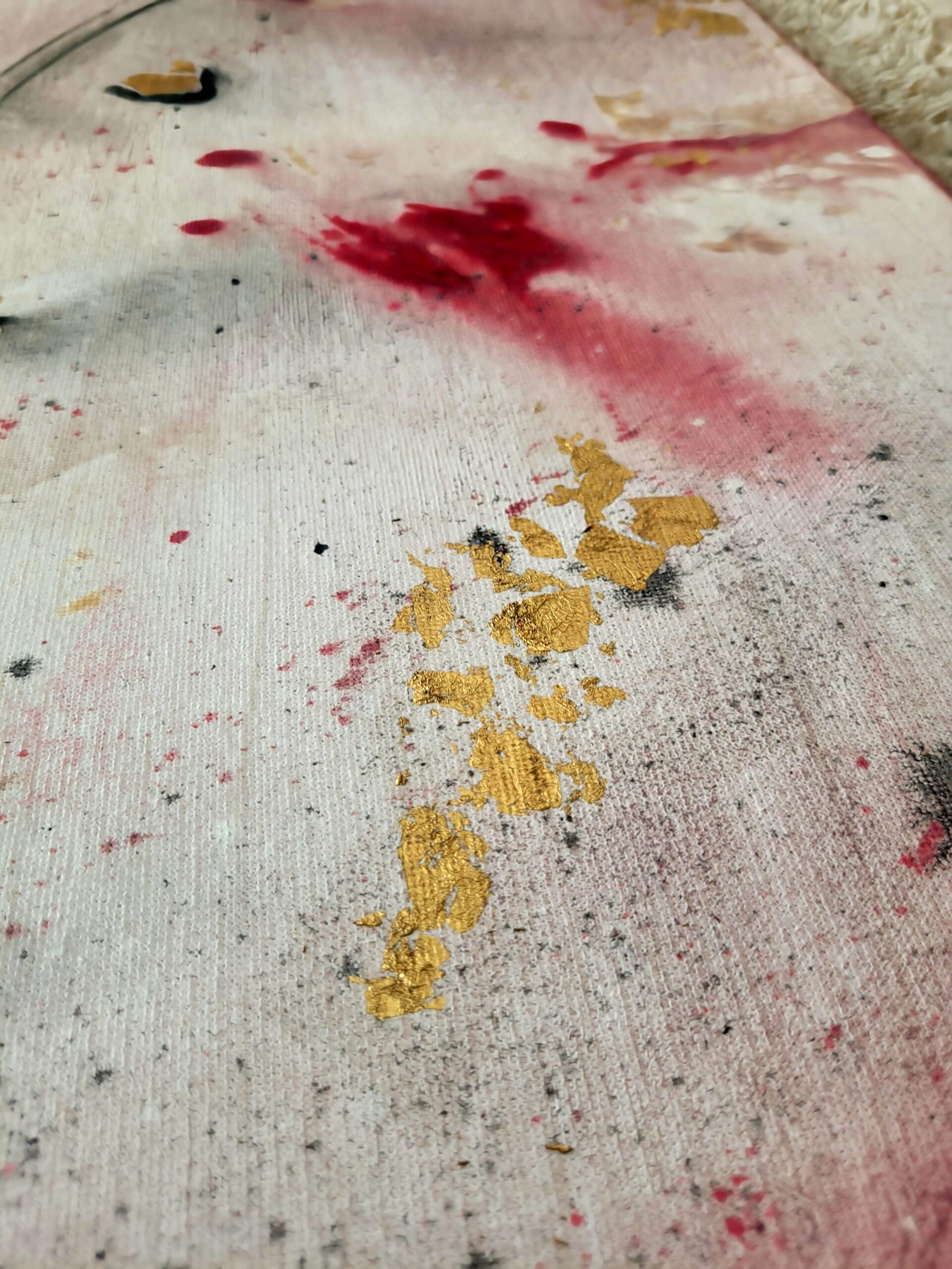 Abstrakcyjny obraz „Roziskrzony Szept” z płatkami złota. Połączenie różu, czerwieni, czerni i złota tworzy dynamiczną, a zarazem subtelną kompozycję, idealną do nowoczesnych wnętrz.